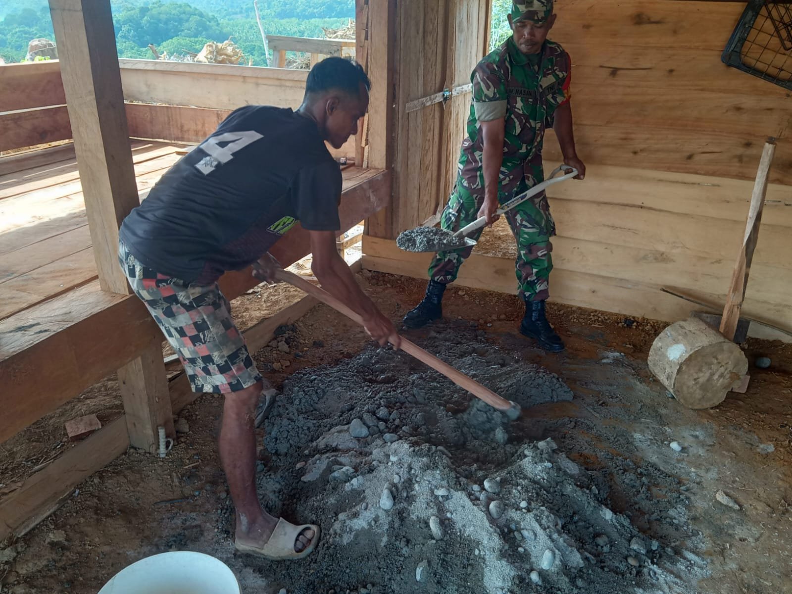 Sertu M. Hasan turut membantu mengaduk semen yang digunakan untuk pengecoran lantai bangunan tersebut. Rumah kebun itu rencananya akan dimanfaatkan sebagai tempat tinggal sementara bagi pemiliknya saat melakukan aktivitas di kebun.