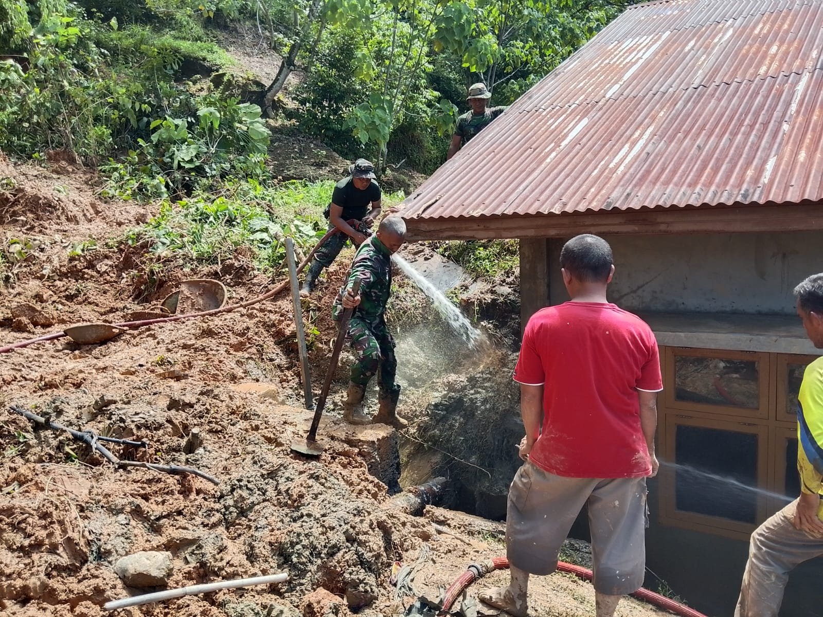 Dengan penuh semangat kebersamaan, cangkul demi cangkul menghantam tanah basah yang berat dan lengket. Di tengah kondisi tanah yang labil, proses pembersihan tetap dilakukan dengan penuh kehati-hatian.