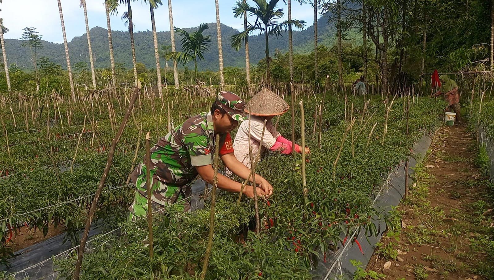 ACEH JAYA — Babinsa Koramil 01/Jaya Kodim 0114/Aceh Jaya, Koptu Aris Kartiko, membantu Bu Saidah memanen cabai merah di Desa Meutara, Kecamatan Jaya, Senin (16/02/2026).