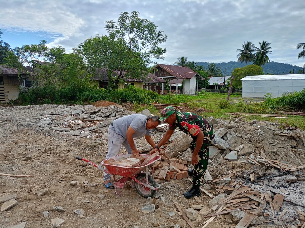 ACEH JAYA – Babinsa Koramil 01/Jaya Kodim 0114/Aceh, Koptu Dedi Januari, menunjukkan kepedulian terhadap warga binaan dengan membantu Bapak Nadirun mengangkat batu bekas bangunan sekolah yang telah dibongkar. Batu-batu tersebut digunakan untuk menimbun bagian samping rumah yang kerap tergenang air saat hujan, di Desa Meunasah Weh, Kecamatan Jaya, Kabupaten Aceh Jaya, Rabu (31/12/2025).