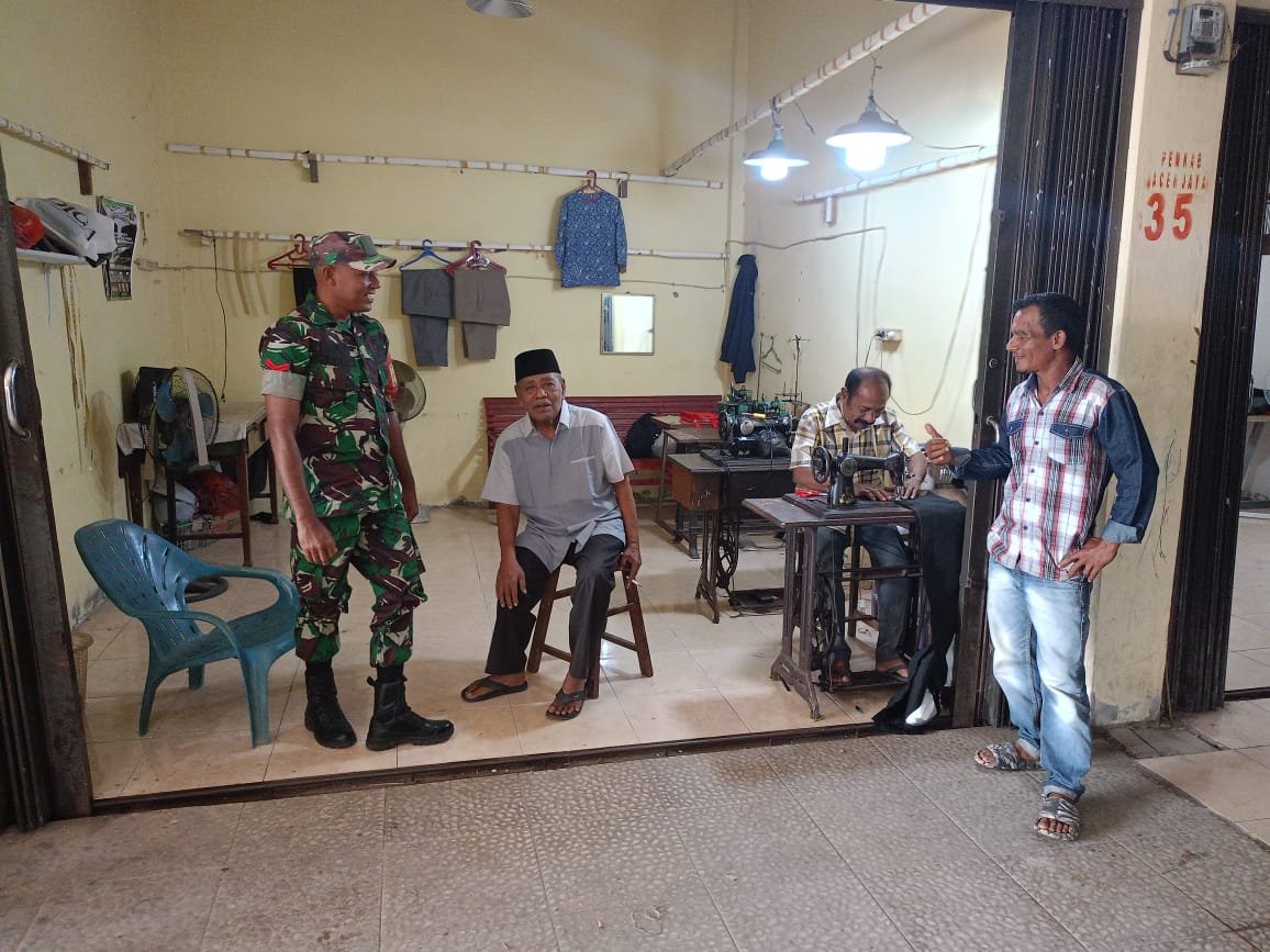 ACEH JAYA – Babinsa Koramil 01/Jaya Kodim 0114/Aceh Jaya, Koptu Dedi Januari, melaksanakan komunikasi sosial bersama tukang jahit setempat, Pak Zakaria, di Desa Pasar Lamno, Kecamatan Jaya, Kabupaten Aceh Jaya, Sabtu (15/11/2025).