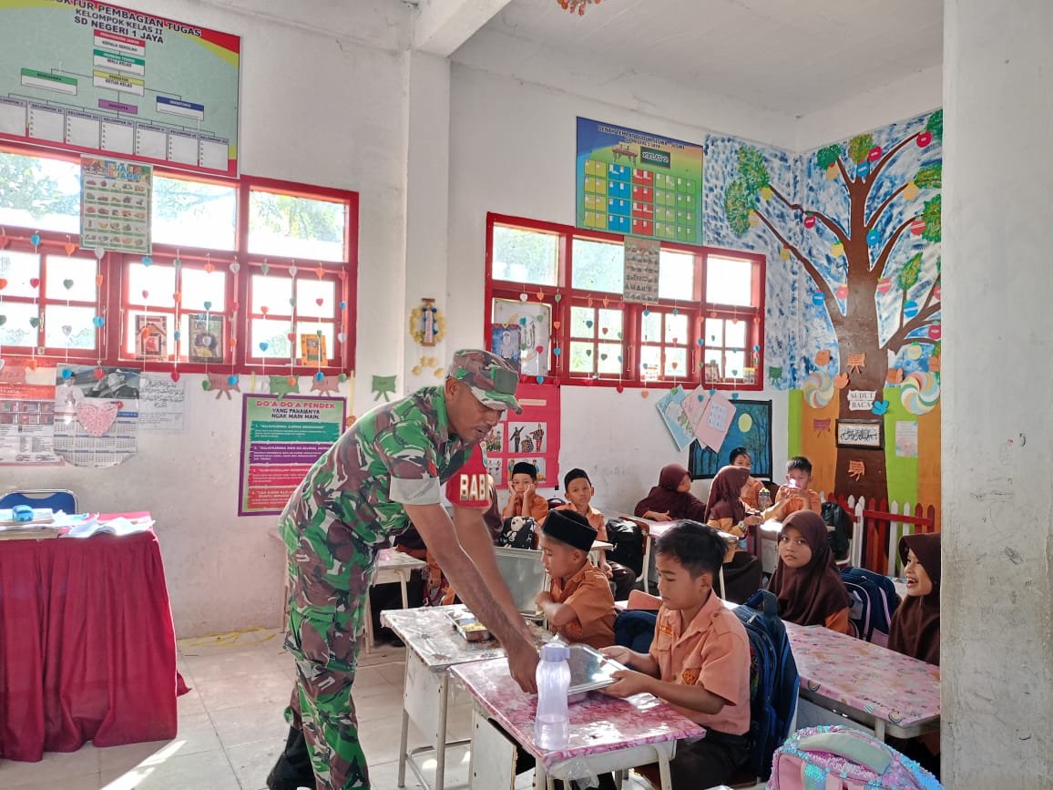 ACEH JAYA – Babinsa Koramil 01/Jaya Kodim 0114/Aceh Jaya, Koptu Dedi Januari, melaksanakan pemantauan pendistribusian makanan bergizi yang disalurkan oleh Tim SPPG Yayasan Kurnia Jaya Abadi kepada siswa dan siswi SD Negeri 1 Jaya, Desa Meunasah Weh, Kecamatan Jaya, Kabupaten Aceh Jaya, Jumat (09/01/2026).