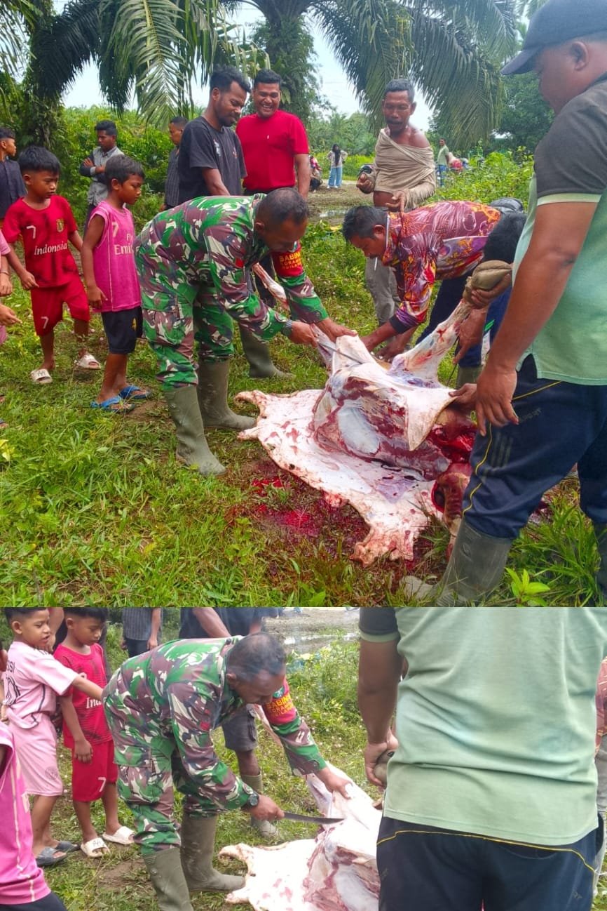 ACEH BARAT – Dalam rangka mempererat hubungan dengan masyarakat sekaligus melestarikan tradisi lokal, Babinsa Koramil 0105-10/Woyla Barat Kodim 0105/Aceh Barat, Kopka Roni Gunawan, turut membantu warga memotong hewan meugang di Desa Blang Cot Mameh, Kecamatan Woyla Barat, Kabupaten Aceh Barat.