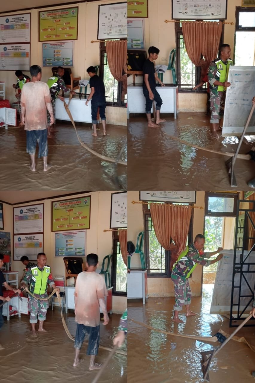 Musibah banjir yang melanda kawasan tersebut mengakibatkan sejumlah fasilitas umum, termasuk sekolah-sekolah, terendam lumpur dan material kayu. Menyikapi hal itu, para Babinsa dengan sigap turun ke lokasi sejak pagi hari untuk meringankan beban masyarakat dan memastikan proses kegiatan belajar mengajar dapat kembali berjalan normal.