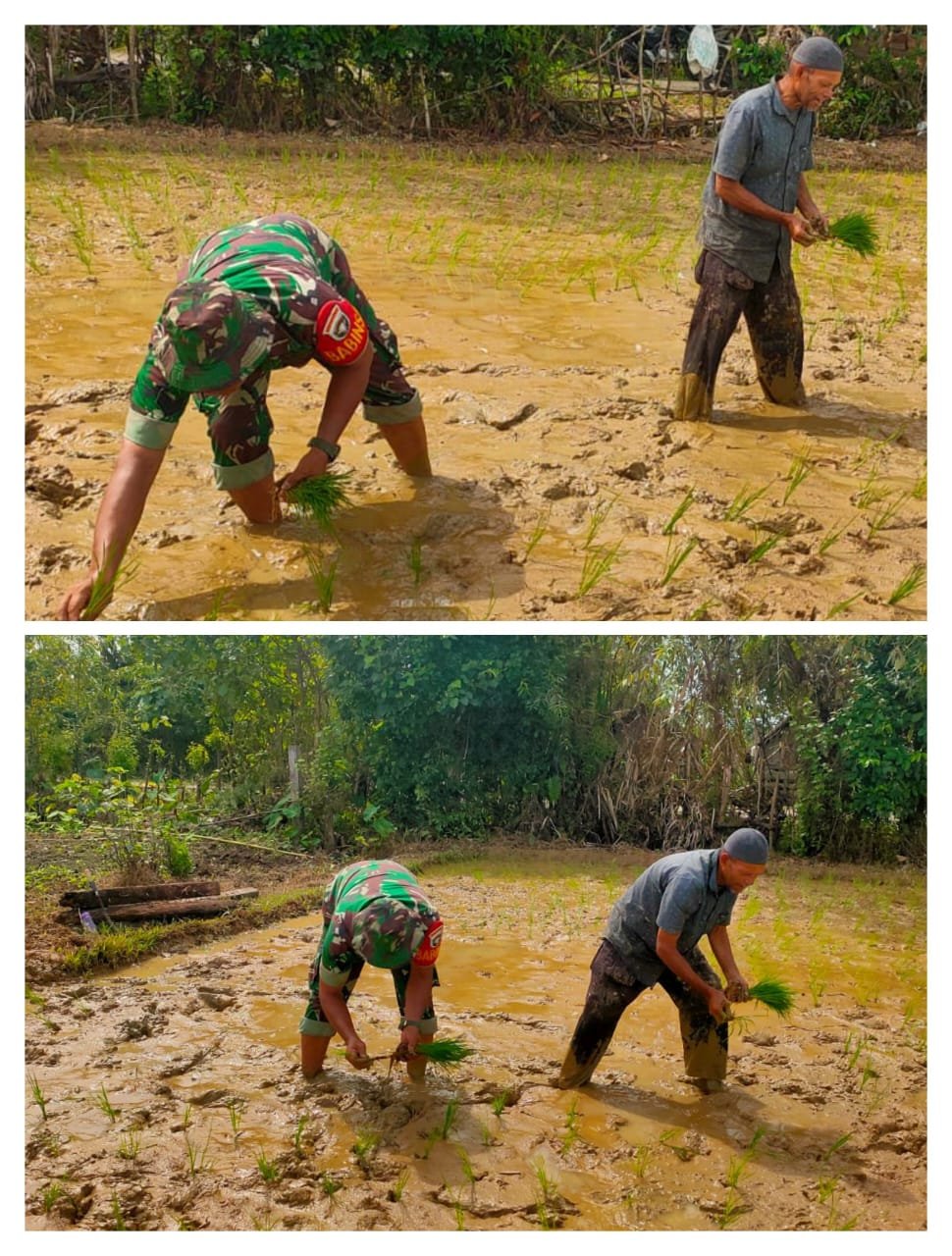 ACEH BARAT — Serka Saferi Pasaribu selaku Babinsa Koramil 03/Kaway XVI Kodim 0105/Aceh Barat turut berpartisipasi langsung membantu warga Desa Alue Tampak, Kecamatan Kaway XVI, Kabupaten Aceh Barat, dalam kegiatan penanaman padi, Sabtu (20/12/2025).