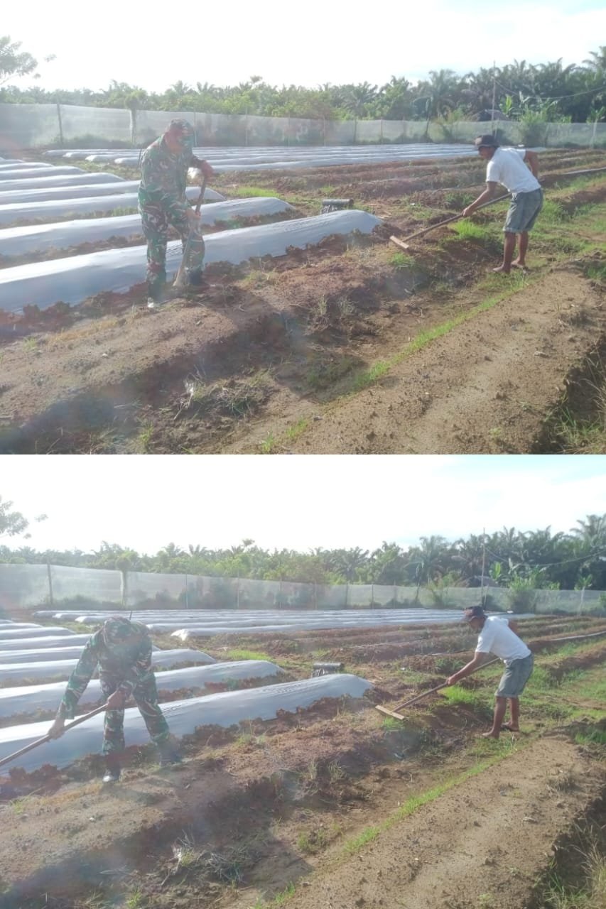 ACEH BARAT — Kendati di hari libur, aparat Komando Kewilayahan tetap melaksanakan tugas pembinaan teritorial. Seperti yang dilakukan Babinsa Koramil 04/Meureubo Kodim 0105/Abar, Serma Pujianto, yang dengan tulus membantu salah satu petani membuat bedengan tanaman cabai merah di Desa Ujong Tanjong, Kecamatan Meureubo, Minggu (28/12/2025).