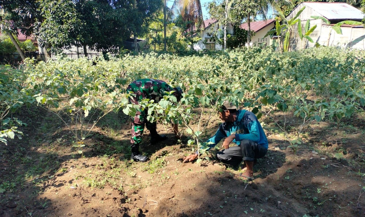 Di tengah hamparan kebun, Babinsa tampak bersemangat dan kompak bersama petani mulai dari pembersihan gulma, mencangkul tanah, hingga menyiapkan bedengan untuk ditanami jenis palawija.