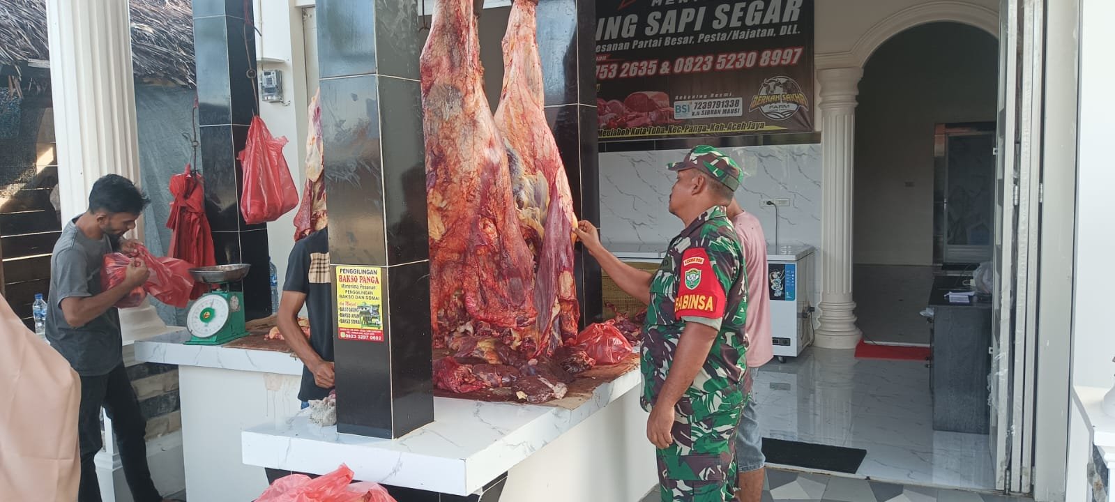 Dalam kegiatan tersebut, Babinsa berdialog langsung dengan Sdr. Khairul (38), salah satu pedagang daging sapi di pasar setempat. Dari hasil komunikasi, diketahui bahwa harga daging sapi untuk meugang tahun ini masih berada dalam kisaran normal, yakni sekitar Rp150.000 per kilogram.