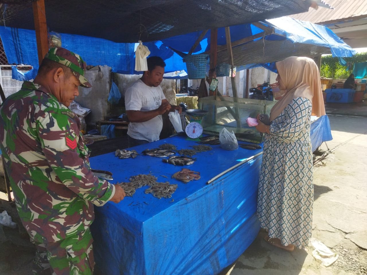 ACEH JAYA – Babinsa Koramil 06/Teunom Kodim 0114/Aceh Jaya, Kopka Farid Wajidi melaksanakan komunikasi sosial bersama pedagang ikan di Pasar Tradisional Kude Teunom, Kamis (04/12/2025). Dalam kesempatan tersebut, Babinsa bertemu dengan salah satu pedagang ikan, Taufiq, untuk berinteraksi dan menyerap informasi terkait aktivitas perdagangan di pasar setempat.