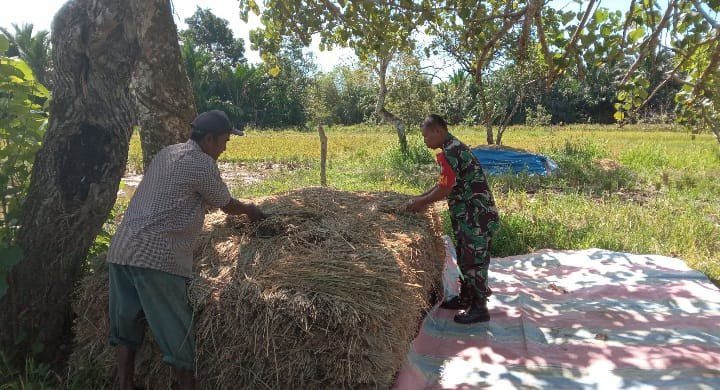 Dengan mengenakan pakaian lapangan dan topi loreng khas TNI, Sertu Heru tampak menyatu dengan para petani, mengangkat dan menyusun batang padi satu per satu. Keringat yang menetes tak mengurangi semangatnya untuk terus bekerja bersama warga. Ia juga memberikan arahan teknis agar susunan padi lebih rapi dan memudahkan proses perontokan.