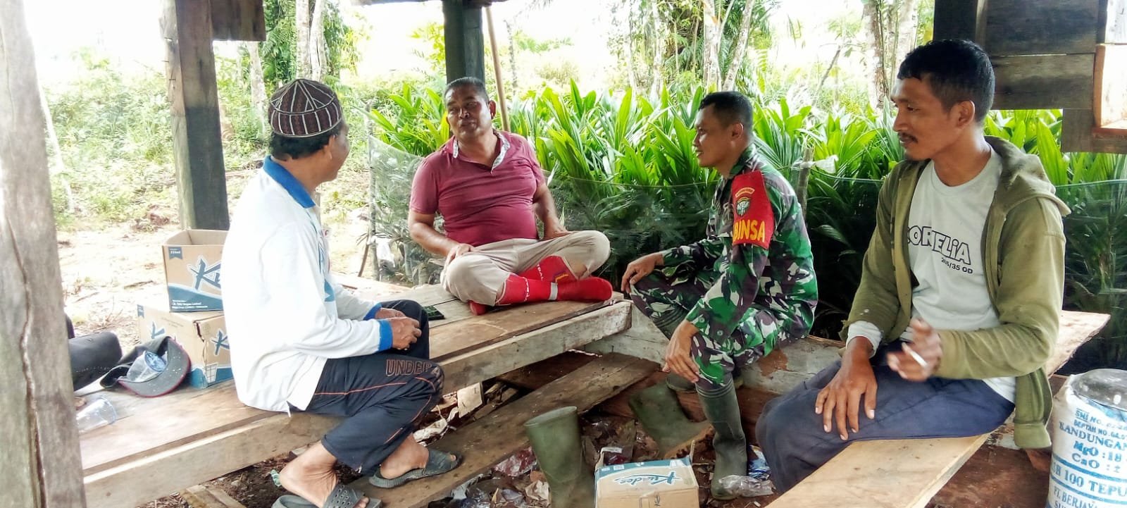 Suasana diskusi berlangsung hangat dan penuh rasa kekeluargaan. Beberapa warga tampak membawa logistik ringan dan duduk bersama di atas panggung kayu, menciptakan momen kebersamaan yang mencerminkan semangat gotong royong. Di sela pembicaraan, Sertu Puguh juga menyempatkan diri mendengarkan aspirasi warga terkait pembangunan dan kesejahteraan desa.