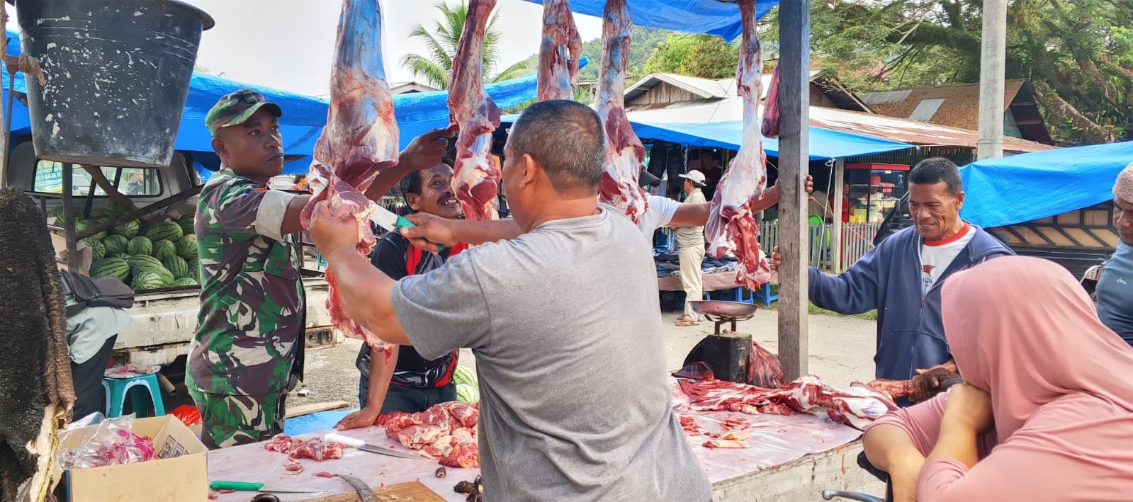 ACEH JAYA – Untuk memastikan stabilitas harga serta keamanan bahan pangan yang beredar di masyarakat, Babinsa Koramil 01/Jaya Kodim 0114/Aceh Jaya, Koptu Rahmat Putra, melaksanakan komunikasi sosial dengan para pedagang daging di Pasar Lamno, Kecamatan Jaya, Kamis (19/3/2026).
