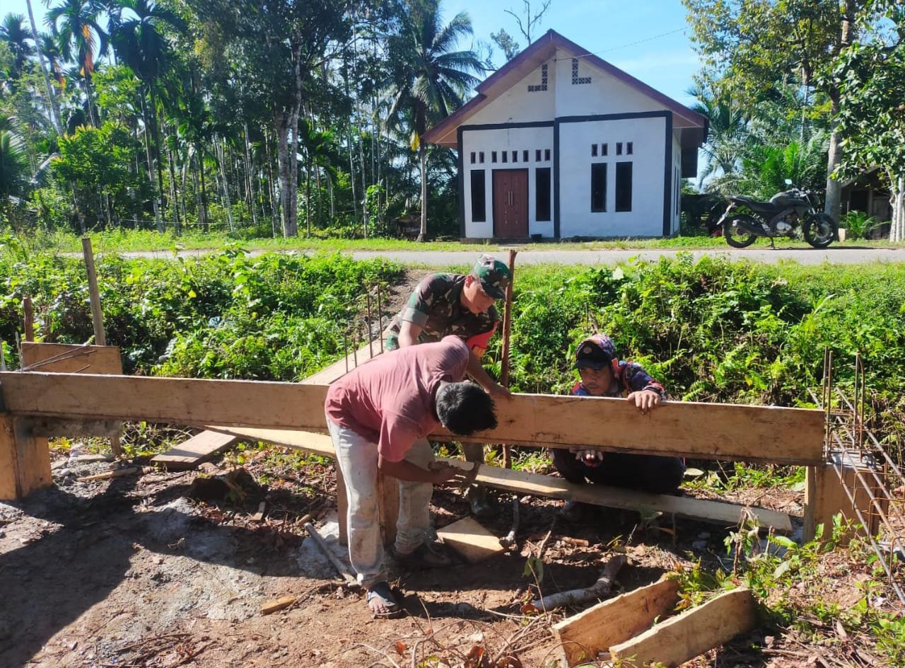 ACEH JAYA – Babinsa Koramil 05/Panga Kodim 0114/Aceh Jaya, Serda Suryadi Putra, melaksanakan kegiatan karya bakti dengan membantu Saudara Irwan (38) dalam pembuatan selop sebagai bagian dari proses pembangunan rumah di Desa Gampong Harapan, Kecamatan Panga, Kabupaten Aceh Jaya, Minggu (04/01/2026).