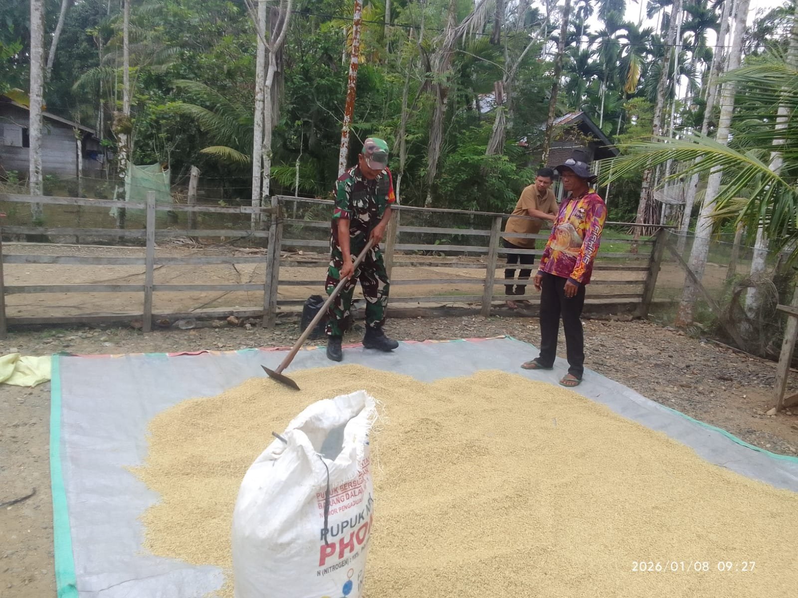 Kegiatan tersebut dilakukan bersama Sdr. Sarifudin yang sedang menjemur hasil panen padi untuk keperluan konsumsi rumah tangga. Kehadiran Babinsa di tengah aktivitas warga ini menjadi bentuk nyata dukungan TNI terhadap ketahanan pangan keluarga di wilayah binaan.