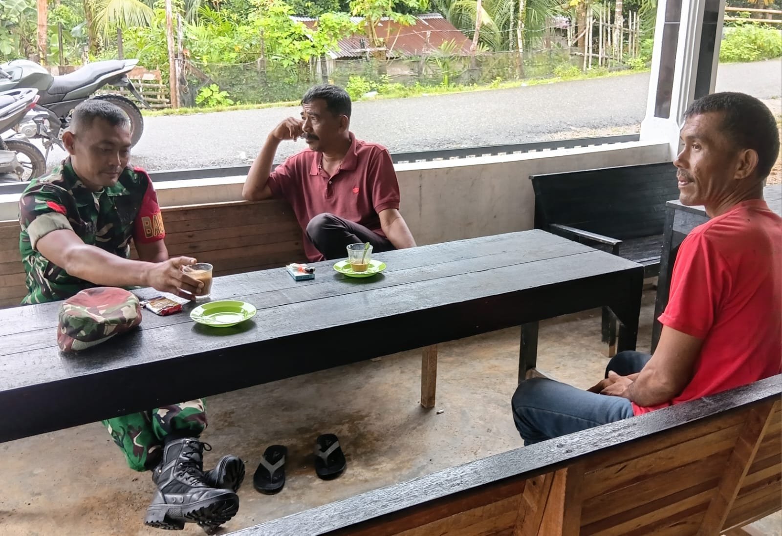 ACEH JAYA — Babinsa Koramil 05/Panga Kodim 0114/Aceh Jaya, Kopka Widodo, melaksanakan komunikasi sosial bersama Geuchik Alu Pande dan warga di Desa Alu Pande, Kecamatan Panga, Kabupaten Aceh Jaya, Minggu (07/12/2025). Pertemuan tersebut berlangsung hangat sebagai wujud kedekatan Babinsa dengan masyarakat dalam mempererat tali silaturahmi di wilayah binaan.