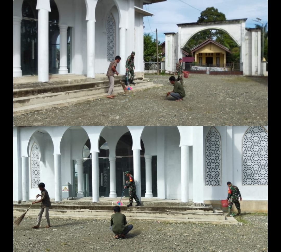 ACEH BARAT – Pembersihan Tempat Ibadah sebagai wujud kepedulian terhadap kebersihan lingkungan serta upaya mempererat kemanunggalan TNI dengan rakyat, Babinsa Posramil 05/PC Kodim 0105/Aceh Barat melaksanakan kegiatan gotong royong bersama masyarakat membersihkan tempat ibadah yang berada di wilayah binaannya, yakni Desa Meunuang Kinco, Kecamatan Pante Ceureumen, Kabupaten Aceh Barat, Minggu (14/12/2025).