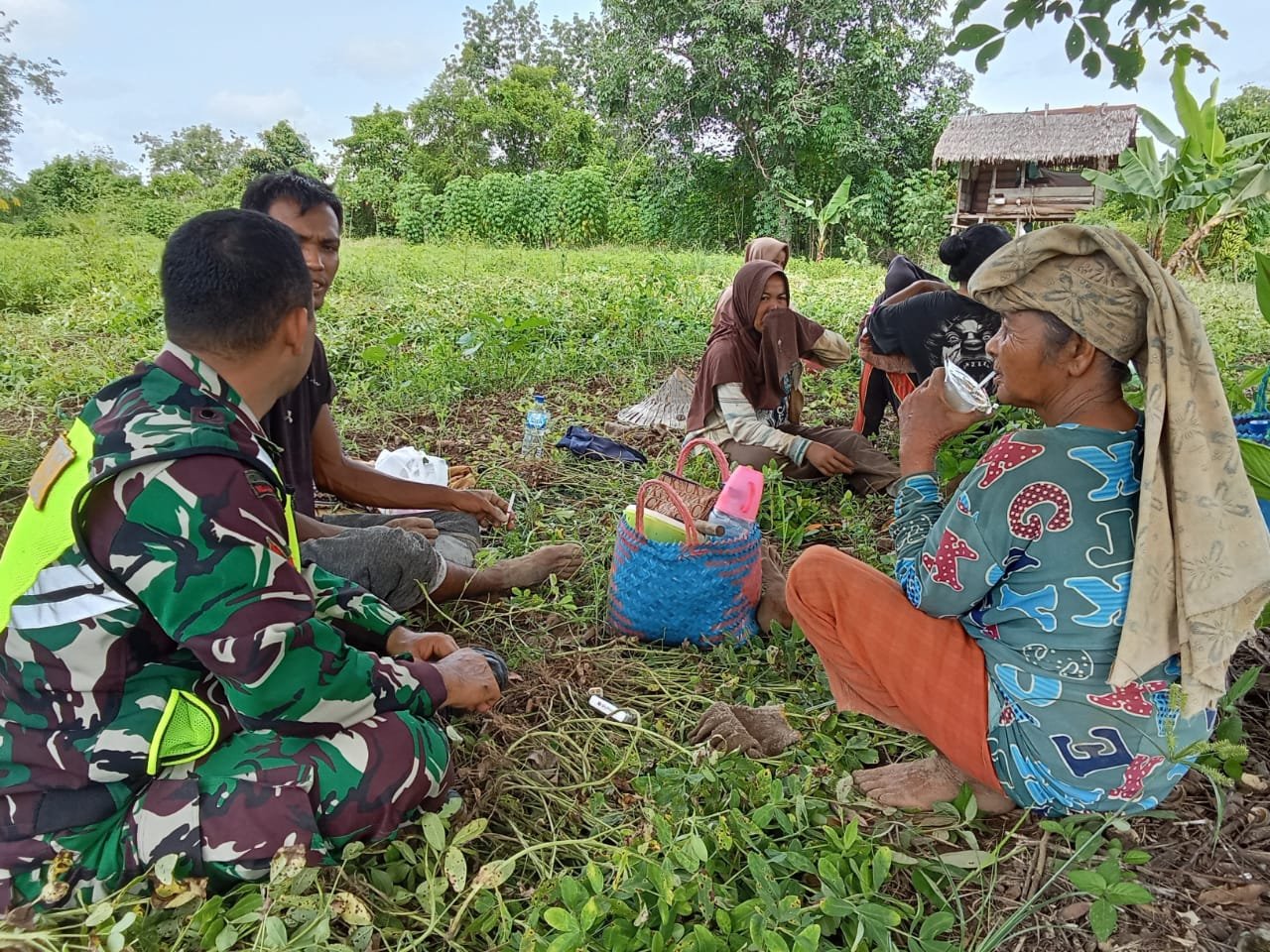Dalam kesempatan itu, Babinsa turut berbaur langsung dengan warga di kebun, membantu kegiatan pertanian, serta berdialog ringan mengenai perkembangan tanaman kacang tanah dan kendala yang dihadapi petani di lapangan.