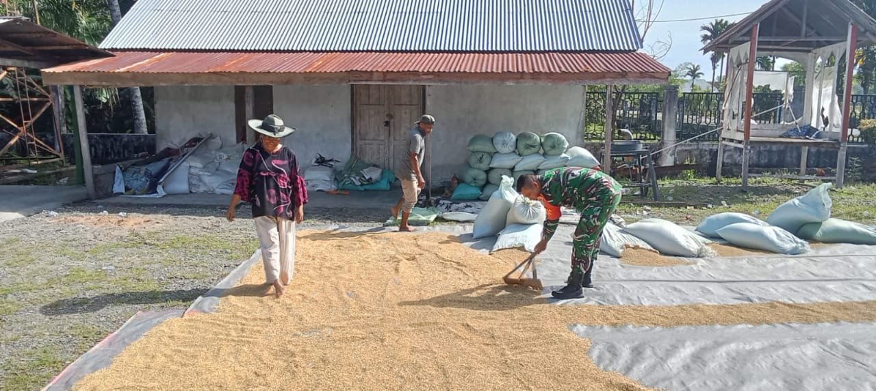 Babinsa yang terjun langsung ke lapangan terlihat membantu warga mulai dari proses pengangkutan gabah, penjemuran, hingga penataan padi di atas tikar atau terpal yang telah disediakan. Meskipun terik matahari cukup menyengat, hal itu tidak menyurutkan semangat Babinsa dalam membantu petani.