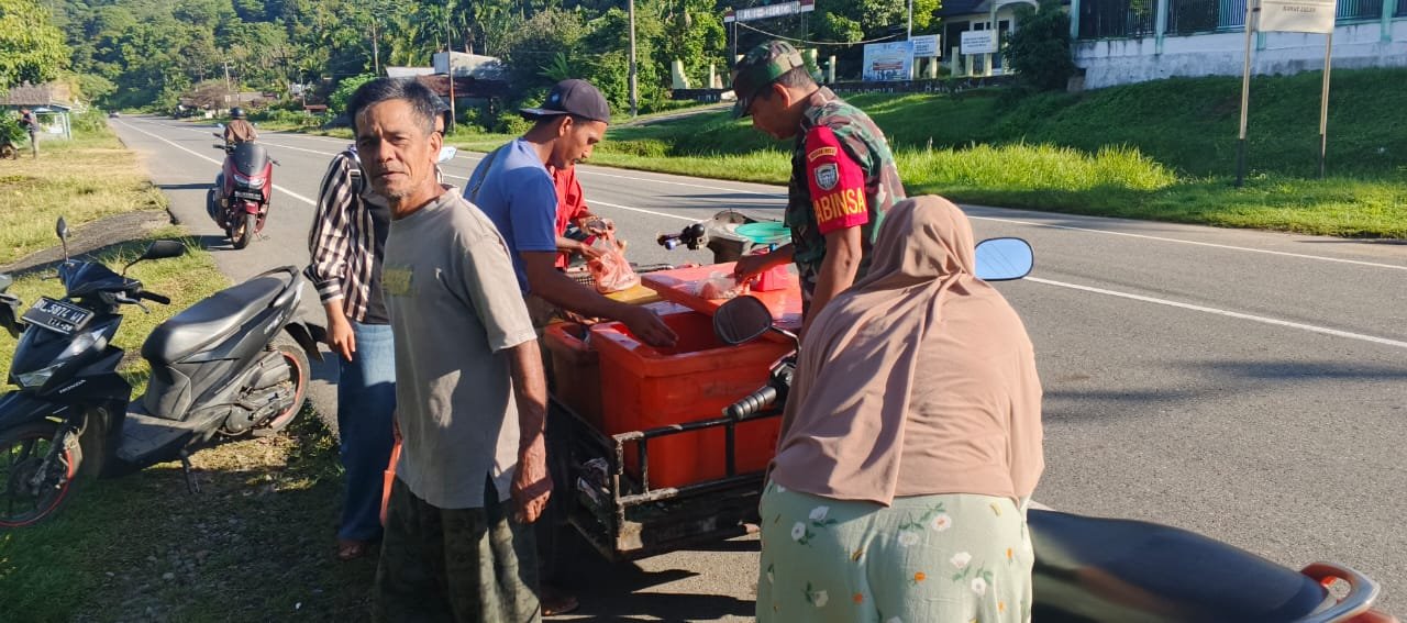 ACEH JAYA – Babinsa Koramil 03/Setia Bakti Kodim 0114/Aceh Jaya, Serda Hendra, melaksanakan kegiatan komunikasi sosial (komsos) dengan pedagang ikan tradisional di Desa Lhok Geulumpang, Kecamatan Setia Bakti, Kabupaten Aceh Jaya.