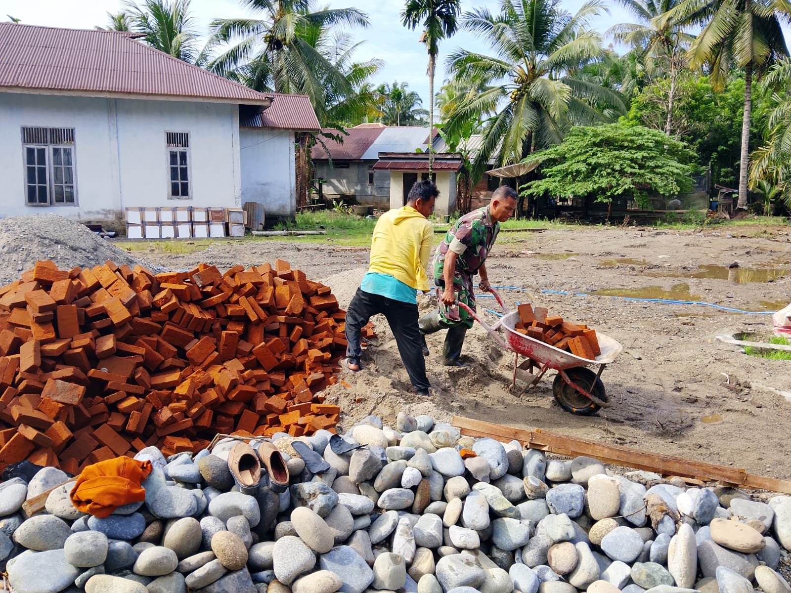 Dalam kegiatan tersebut, Serka Muhammad Daud bersama warga bergotong royong mengangkat batu bata menggunakan argo (gerobak dorong) untuk pembuatan pondasi rumah salah satu warga. Kehadiran Babinsa di tengah masyarakat menjadi penyemangat tersendiri dalam mempercepat proses pembangunan.