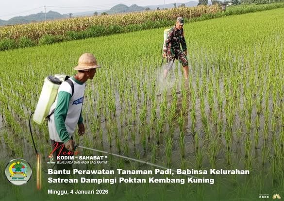 Blitar – Babinsa Kelurahan Satrean Koramil 0808/03 Kanigoro Serda Susanto bersama Kelompok Tani Kembang Kuning melaksanakan kegiatan perawatan tanaman padi berupa penyemprotan tanaman, bertempat di Kelurahan Satrean Kecamatan Kanigoro Kabupaten Blitar, Minggu (4/1/2026).