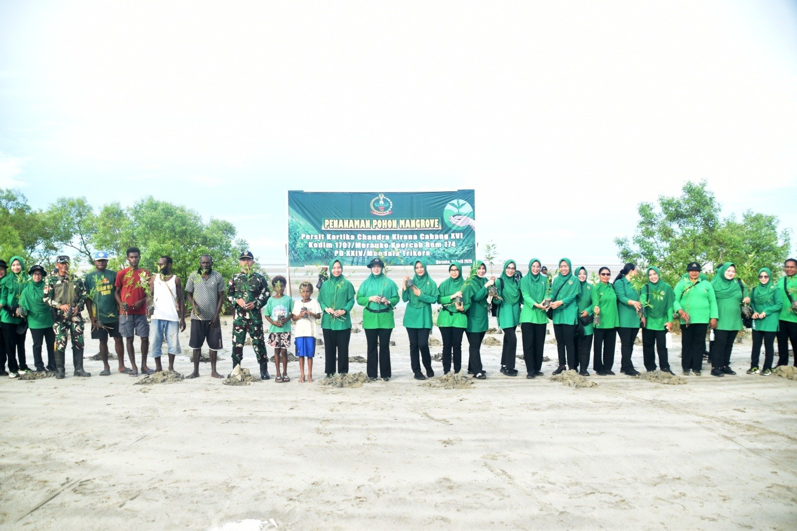 MERAUKE – Aksi nyata kepedulian terhadap lingkungan kembali ditunjukkan oleh Persit Kartika Chandra Kirana Cabang XVI Kodim 1707/Merauke Koorcab Rem 174 PD XXIV/Mandala Trikora melalui kegiatan penanaman pohon mangrove yang berlangsung di Pantai Payum, Kelurahan Samkai, Distrik Merauke, Kabupaten Merauke, Provinsi Papua Selatan, pada Selasa pagi (21/04/2026). Kegiatan dipimpin langsung oleh Ketua Persit Ny. Asti Dili Eko Setyawan didampingi Dandim 1707/Merauke Letkol Czi Dili Eko Setyawan, S.Ak., M.Han.