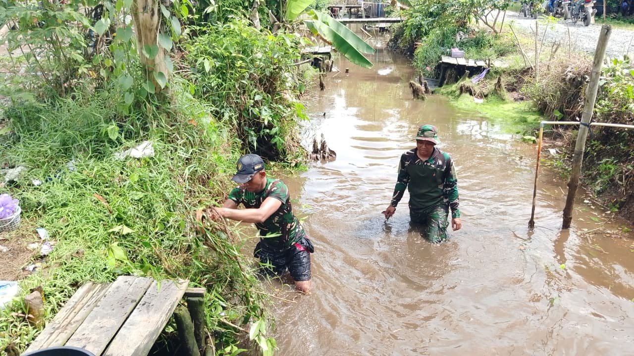 Dengan semangat kebersamaan, Serma Ardiansyah bersama warga bahu membahu membersihkan sampah dan tumbuhan liar yang menghambat aliran sungai.