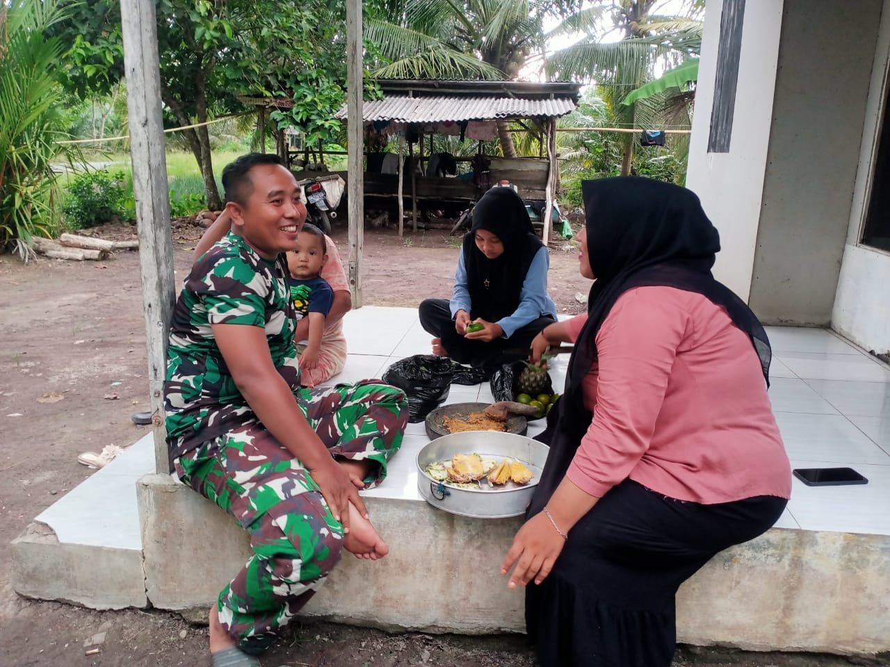 BARITO KUALA – Suasana keakraban begitu terasa di Desa Tumih, Kecamatan Wanaraya, saat anggota Satgas TMMD Ke-126 Kodim 1005/Barito Kuala menyempatkan diri untuk beranjangsana ke rumah warga. Di sela waktu istirahat, para prajurit tampak duduk santai di teras rumah warga sambil menikmati rujak buatan ibu-ibu desa.