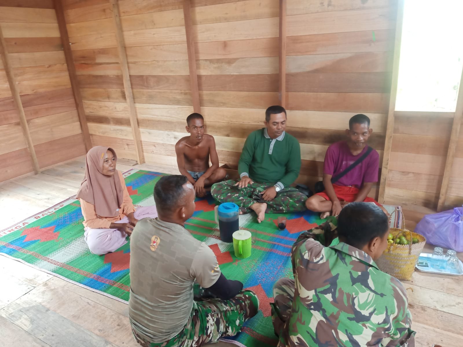 BARITO KUALA – Di sela-sela padatnya kegiatan fisik, suara tawa kecil terdengar dari sudut rumah sederhana milik Kai Salamun di Desa Tumih, Kecamatan Wanaraya. Rabu (21/10), Sejumlah prajurit Satgas TMMD Ke-126 Kodim 1005/Barito Kuala tampak duduk bersila di tanah, bercengkrama hangat dengan anak dari Kai Salamun — anak istimewa dengan keterbelakangan mental yang tetap menebar senyum tulus kepada siapa pun yang menyapanya.