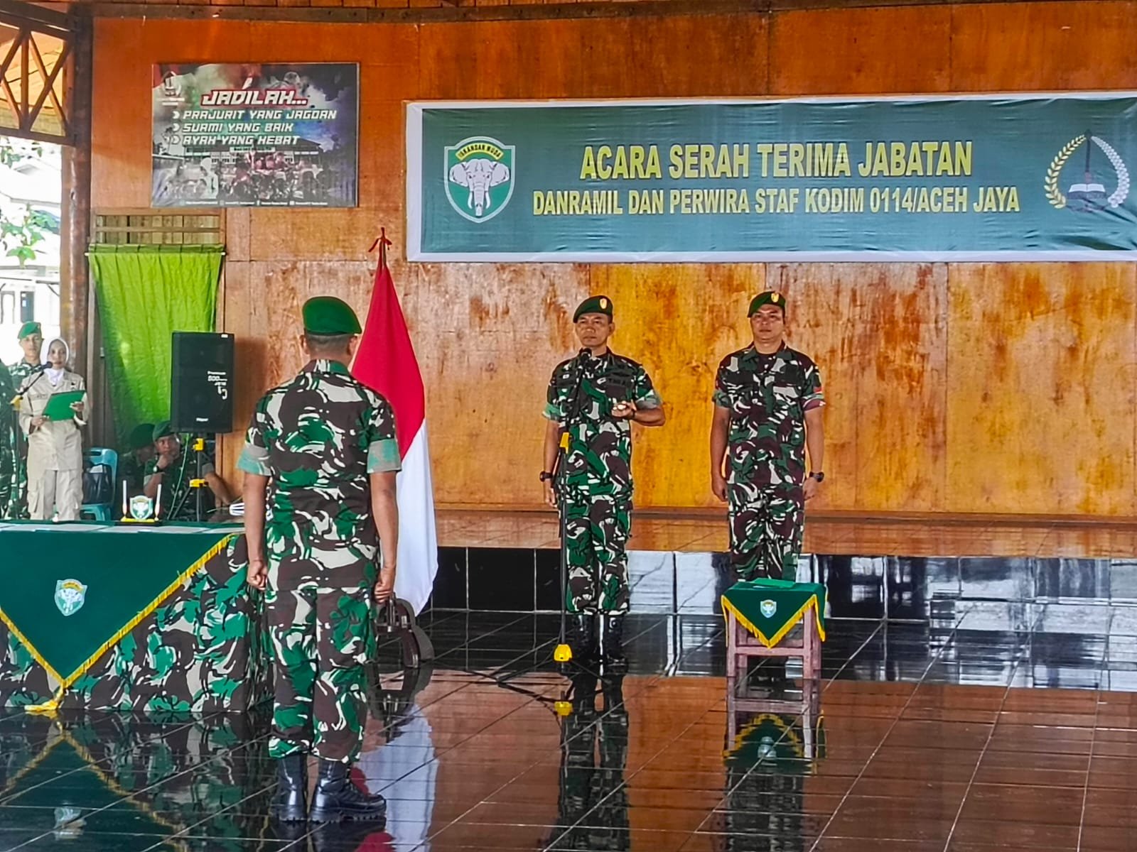 ACEH JAYA — Komandan Kodim 0114/Aceh Jaya Letkol Czi Aris Widiatmoko, S.I.P., memimpin langsung Upacara Laporan Korps Serah Terima Jabatan (Sertijab) Danramil dan Perwira Staf yang digelar di Joglo Makodim 0114/Aceh Jaya, Senin (19/01/2026).