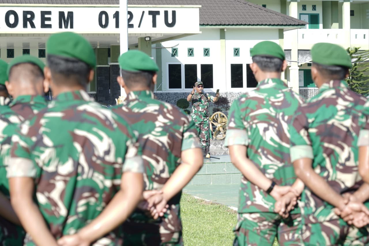 Meulaboh – Danrem 012/TU Kolonel Inf Windarto S.Sos., M.M. menekankan kepada seluruh prajurit agar senantiasa menjauhi segala bentuk pelanggaran sekecil apa pun dalam pelaksanaan tugas maupun kehidupan sehari-hari. Kegiatan tersebut bertempat di Lapangan Makorem 012/TU, Desa Ujong Tanoh Darat, Kecamatan Meureubo, Kabupaten Aceh Barat, Senin (13/04/2026).