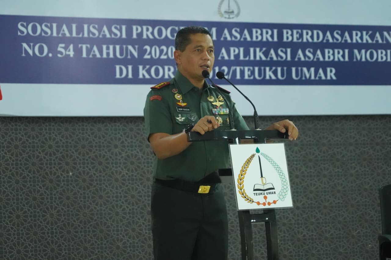 Dalam sambutannya, Danrem 012/TU Kolonel Inf Benny Rahadian, S.E., M.Han., menyampaikan apresiasi kepada pihak ASABRI yang telah melaksanakan kegiatan sosialisasi tersebut. Menurutnya, kegiatan ini sangat penting guna memberikan pemahaman menyeluruh kepada prajurit dan PNS TNI AD mengenai hak dan kewajiban mereka sebagai peserta ASABRI.