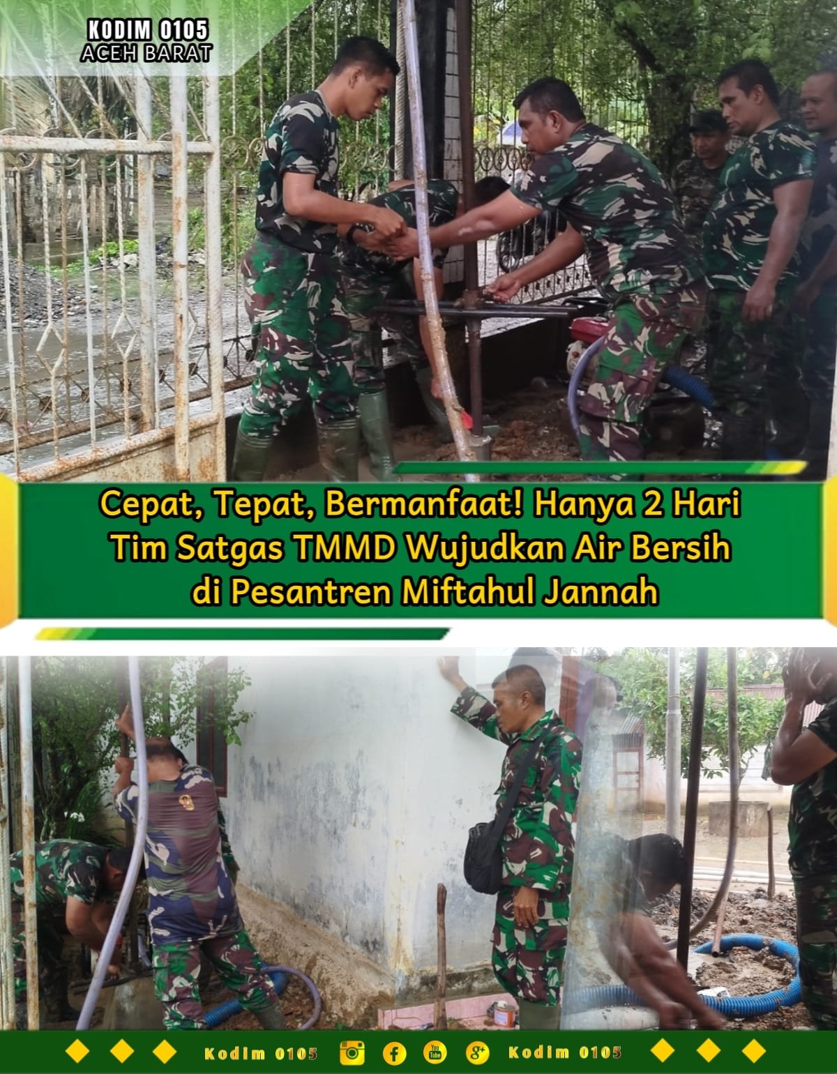 ACEH BARAT – Wajah-wajah ceria para santri Pesantren Miftahul Jannah di Desa Lueng Jawa, Kecamatan Woyla, kini tak lagi dihantui kesulitan air bersih. Hanya dalam dua hari, Satgas TMMD Reguler ke-127 Kodim 0105/Abar berhasil menuntaskan pembangunan satu unit sumur bor, Senin (23/2/2026).