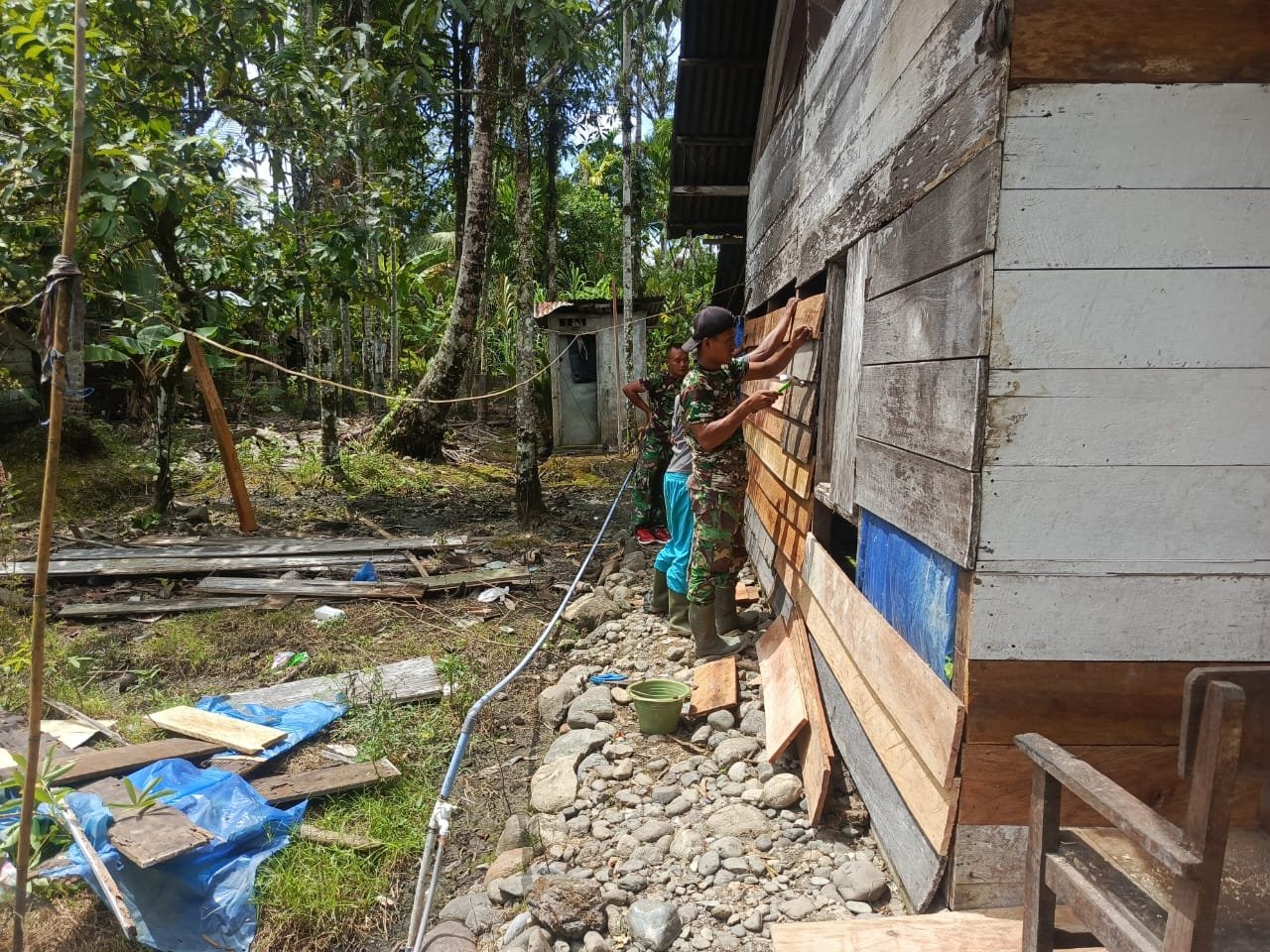 Kapten Inf Erwansyah yang memimpin pekerjaan di titik kedua mengatakan, proses hari ini difokuskan pada penggantian papan dinding yang sudah tidak layak.