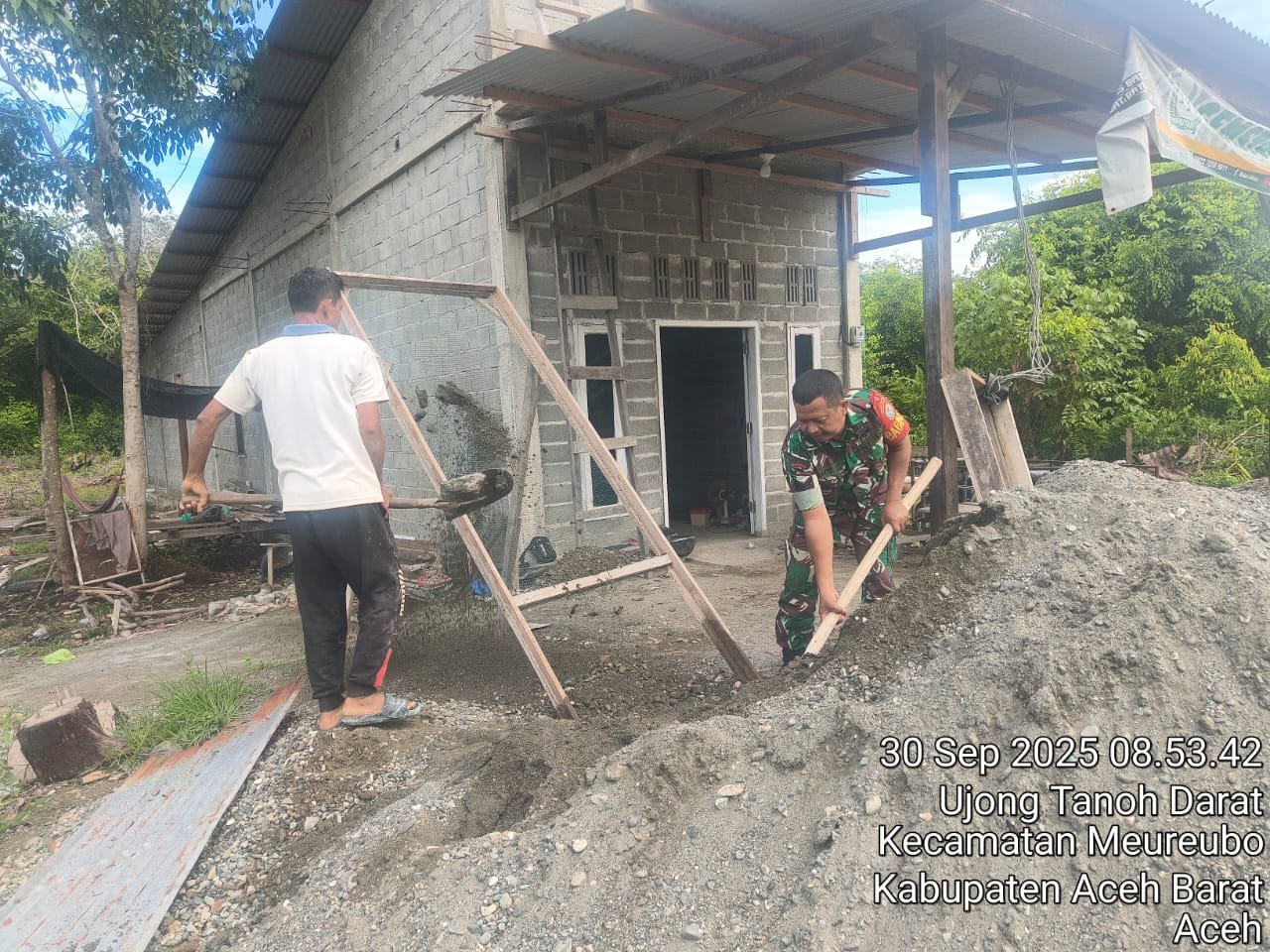 ACEH BARAT – Guna terciptanya kedekatan dan keharmonisan TNI dengan rakyat, Babinsa Koramil 04/Mrb Kodim 0105/Abar Serka Sunarto Lubis turut ambil bagian membantu warga binaan mengangkut sekaligus mengayak sirtu (pasir batu) sebagai bahan material untuk memplester dinding rumah yang berlokasi di Desa Ranto Panjang Timur, Kecamatan Meureubo, Kabupaten Aceh Barat, Minggu (5/10/2025).