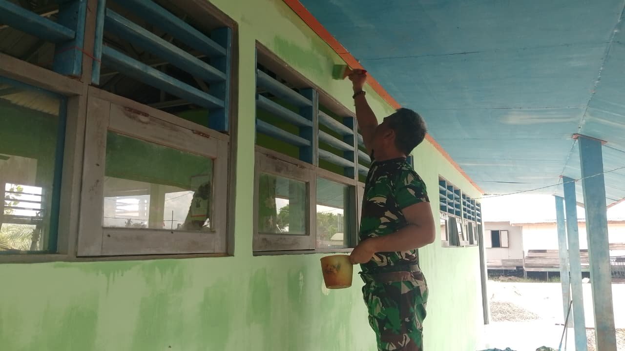 BARITO KUALA – Tangan-tangan terampil prajurit TNI kembali menunjukkan kepeduliannya. Kali ini, anggota Satgas TMMD Ke-126 Kodim 1005/Barito Kuala memoles cat bangunan Taman Kanak-kanak (TK) di Desa Tumih, Kecamatan Wanaraya, agar tampil lebih indah dan nyaman bagi anak-anak yang belajar di sana.