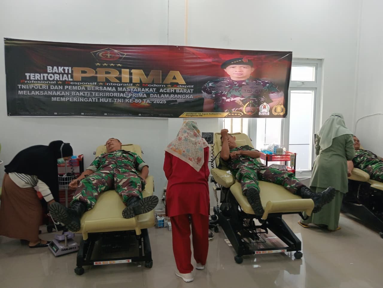 Johan Pahlawan, Sabtu (20/9/2025) — Dalam rangka menyambut Hari Ulang Tahun (HUT) TNI ke-80 yang jatuh pada 5 Oktober 2025, Satuan jajaran Korem 012/Teuku Umar menggelar kegiatan donor darah yang melibatkan prajurit TNI dan Persit dari Kodim 0105/Abar. Acara ini dilaksanakan pada Sabtu, 20 September 2025, bertempat di Rumah Sakit Umum Daerah (RSUD) Cut Nyak Dhien, Jalan Gajah Mada, Desa Drien Rampak, Kecamatan Johan Pahlawan.