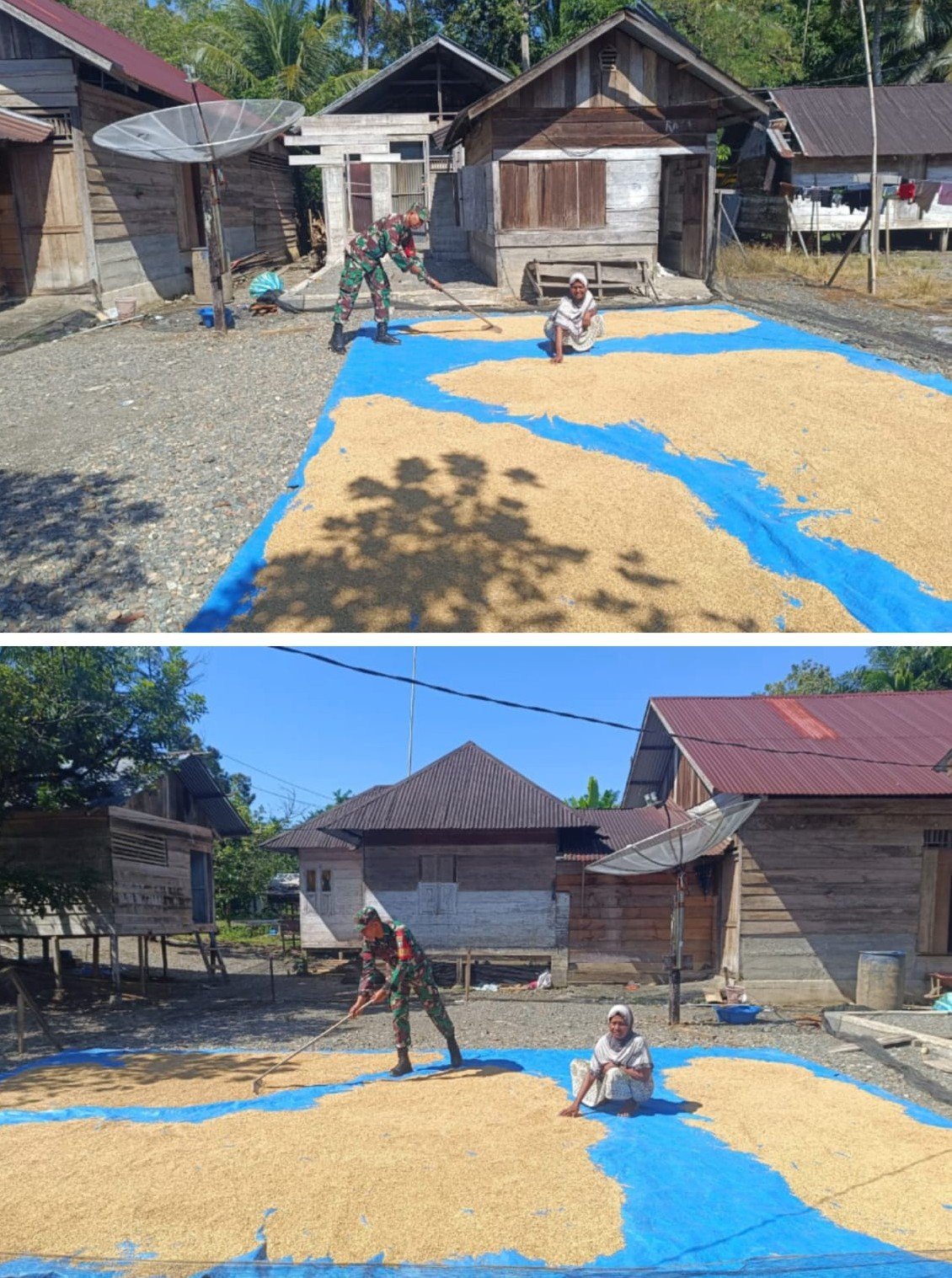 ACEH BARAT – Koptu Said Saiful Azmi, Babinsa Posramil 12/Panton Reu, Kodim 0105/Abar, melaksanakan kegiatan pendampingan kepada warga binaan dengan membantu menjemur padi di Gampong Manggie, Senin (20/04/2026).
