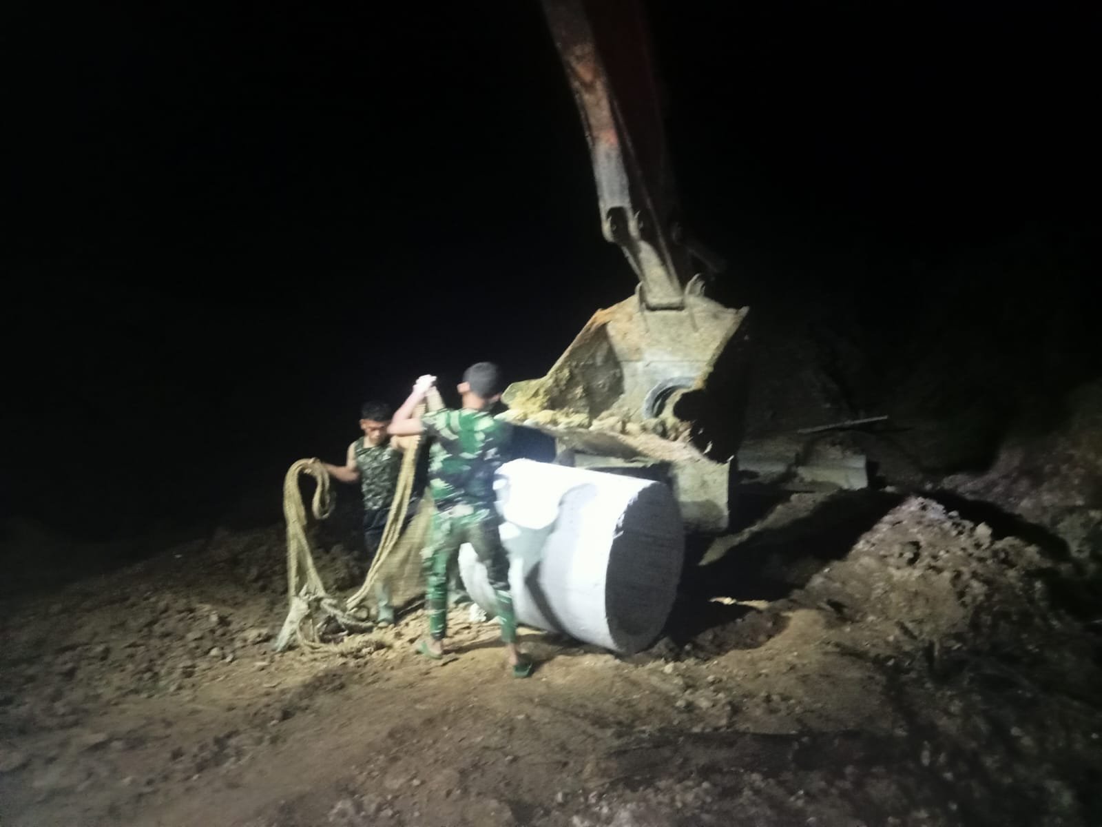Pada Sabtu (7/3/2026) malam, para anggota satgas terlihat melanjutkan pekerjaan distribusi gorong-gorong yang akan dipasang sebagai bagian dari sistem drainase jalan yang sedang dibangun melalui program TMMD.