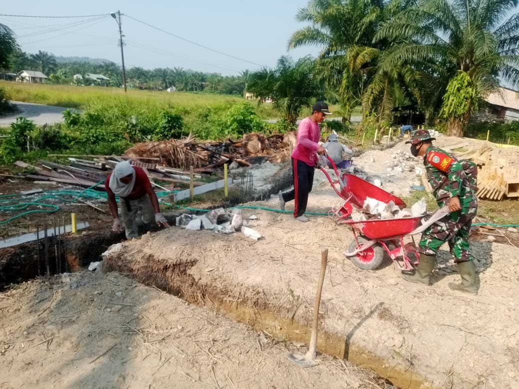 Terlihat Serda Badari turut berbaur bersama para pekerja dan warga, mulai dari persiapan lahan hingga pengangkutan material bangunan. Kebersamaan tersebut mencerminkan semangat gotong royong serta kepedulian terhadap kelancaran dan keselamatan pekerjaan.