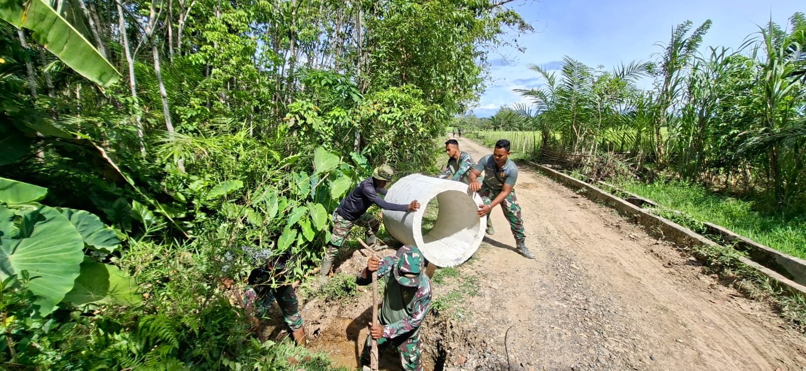 Pemasangan gorong-gorong ini bertujuan untuk memastikan kelancaran aliran air menuju lahan pertanian dan perkebunan milik warga. Di bawah terik matahari, personel Satgas dan masyarakat tampak kompak bahu-membahu menurunkan material, mengatur posisi cincin, hingga melakukan penimbunan dan perapian badan jalan.