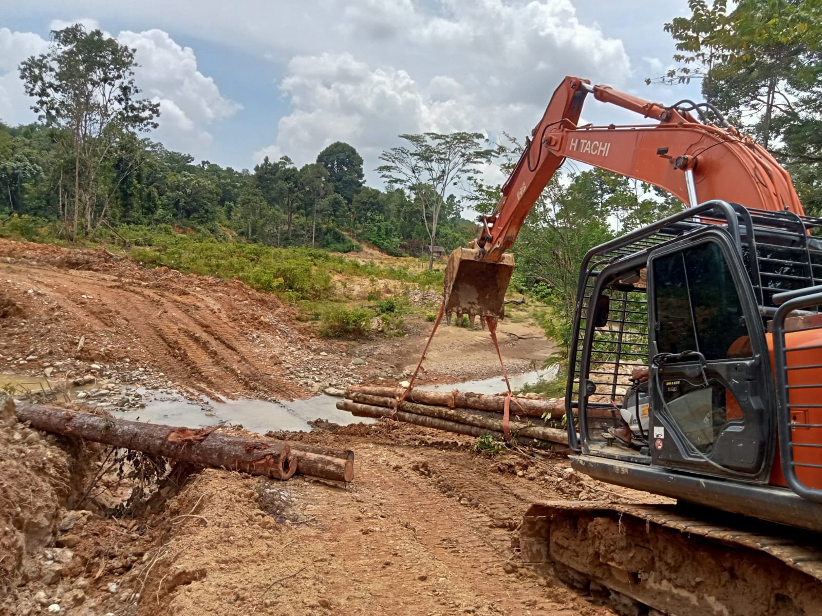 Dalam foto terlihat alat berat mengangkat batang-batang kayu glondongan yang kemudian ditempatkan pada bagian dasar jalan. Kayu tersebut akan menjadi lapisan pertama sebelum ditutup dengan timbunan tanah.