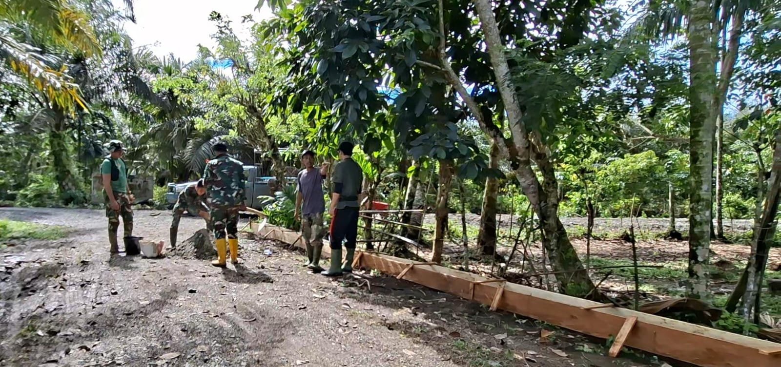 Prosesnya dilakukan bertahap. Material diangkut bersama, bekisting dirakit dengan teliti, lalu beton dituangkan perlahan hingga membentuk dinding penyangga yang kokoh. Setiap tetes keringat menjadi bagian dari cerita perjuangan.