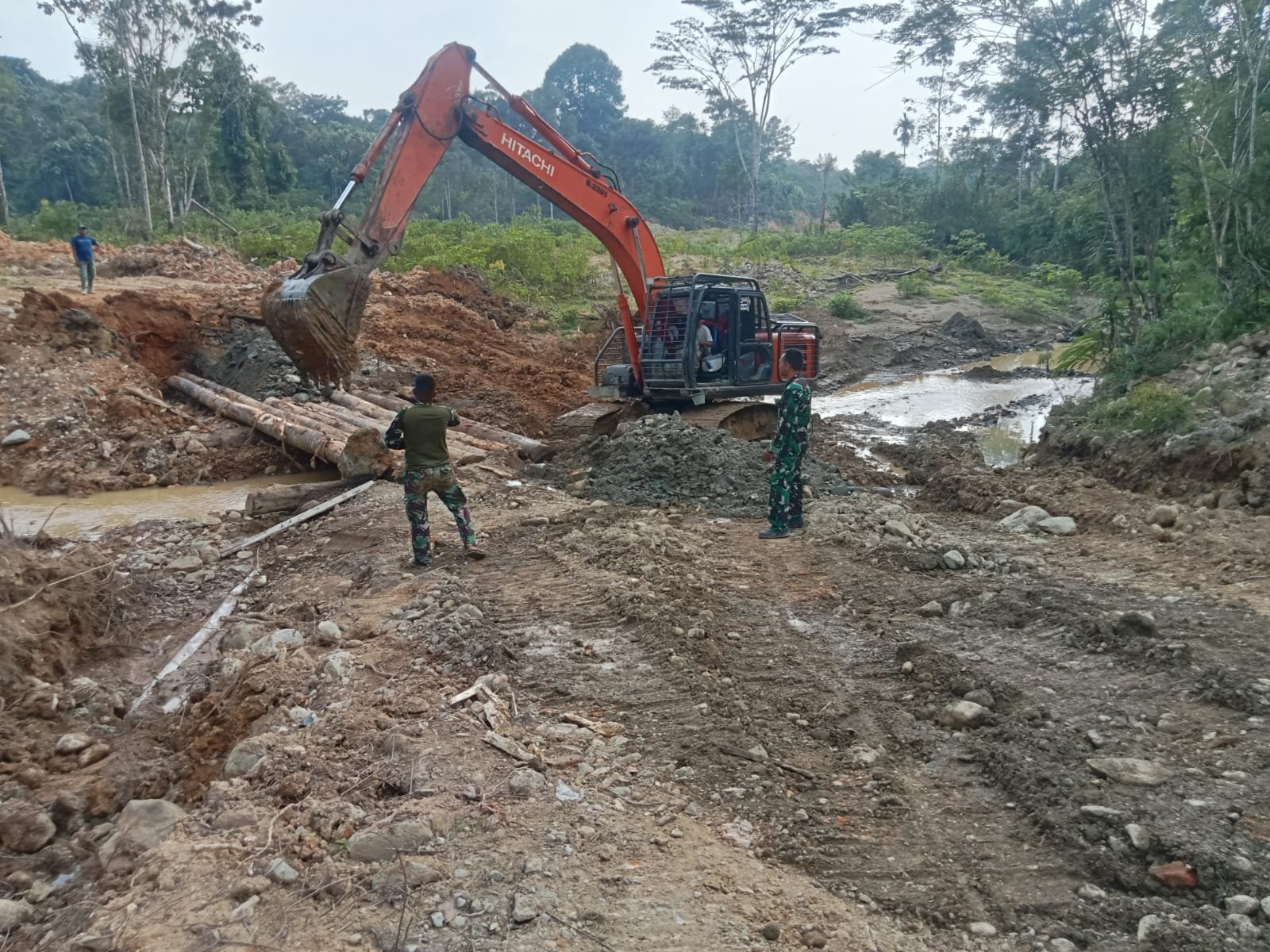 Kapten Inf Amrin yang berada di lokasi menjelaskan bahwa pembuatan drainase serta jembatan darurat merupakan tahap penting agar jalan yang dibangun nantinya memiliki daya tahan yang baik.