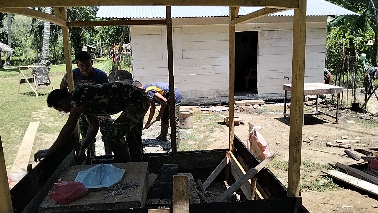 Dengan semangat gotong royong, personel TNI dan masyarakat bahu membahu menyelesaikan pembangunan fasilitas sanitasi tersebut.