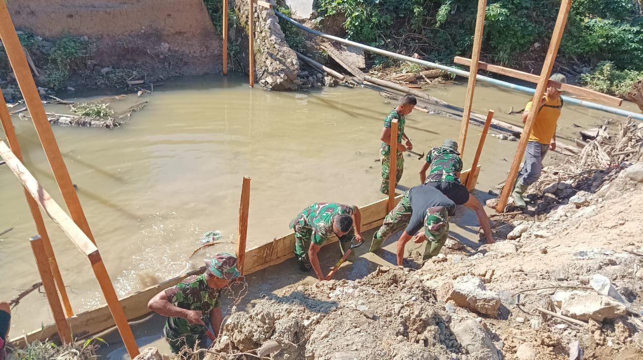 Pemandangan di lokasi pembangunan menunjukkan perjuangan fisik yang cukup berat. Para personel harus bekerja di dalam genangan air untuk mengeluarkan luapan air sungai dari struktur kerangka jembatan beton. Langkah ini dilakukan agar proses pengecoran material campuran semen, besi, dan pasir dapat berjalan dengan baik serta menghasilkan struktur jembatan yang kuat dan berkualitas.