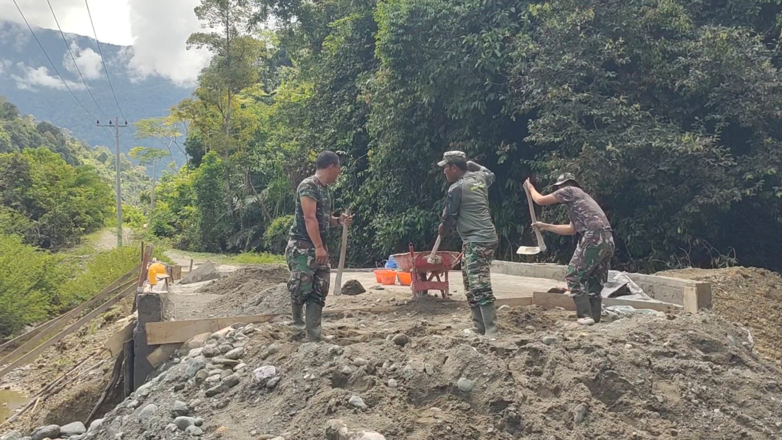 Saat ini, fokus pengerjaan berada pada tahap pengecoran lantai jembatan yang dikebut guna mempercepat proses penyelesaian. Di lokasi, tampak personel TNI bahu-membahu dengan masyarakat, bekerja penuh semangat demi menuntaskan pembangunan infrastruktur vital tersebut.