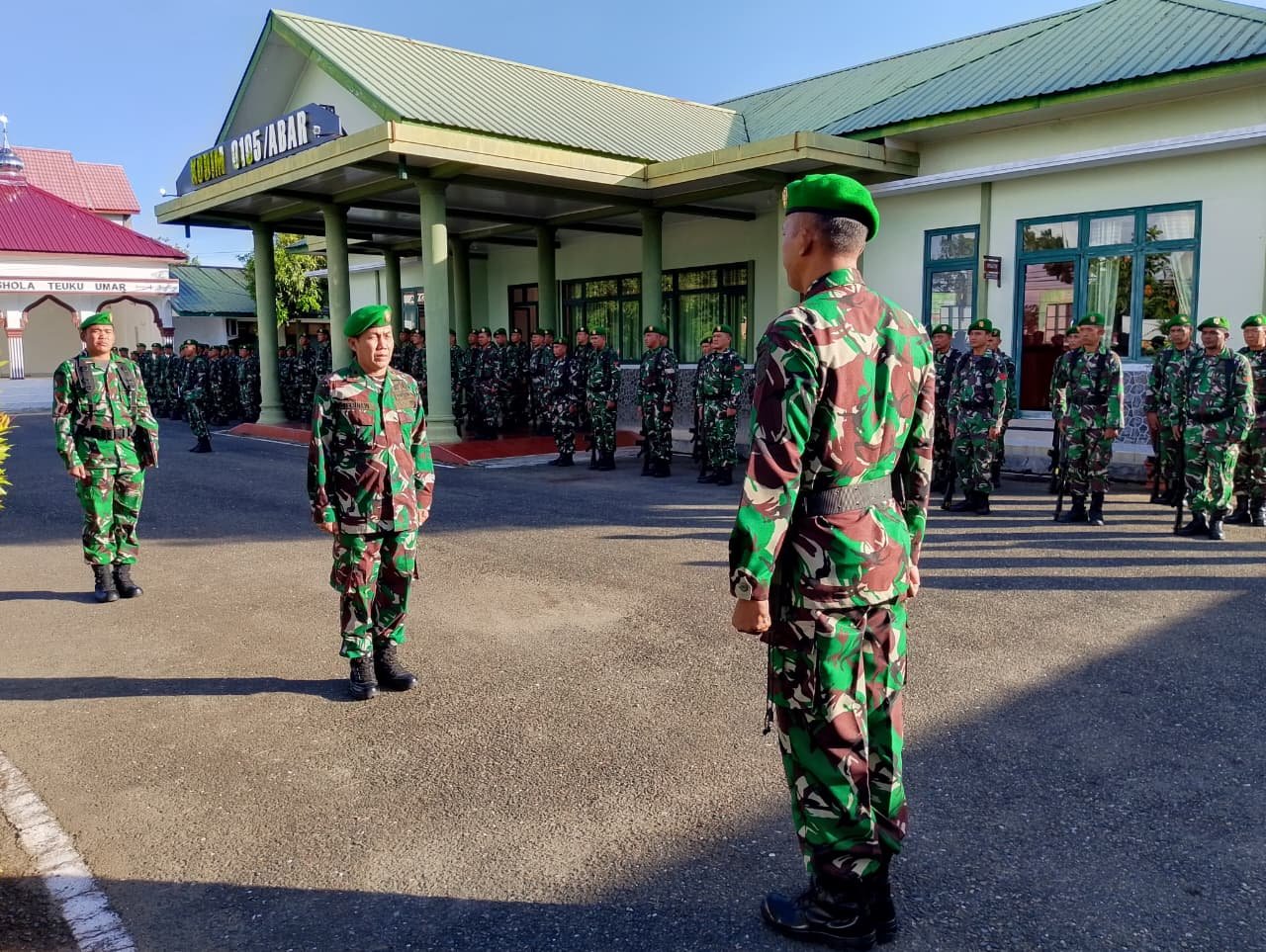 ACEH BARAT – Wujud nyata cinta bangsa dan negara, prajurit Kodim 0105/Abar melaksanakan upacara bendera dengan penuh khidmat di Makodim setempat, Jalan Imam Bonjol, Desa Drien Rampak, Kecamatan Johan Pahlawan, Senin (30/3/2026).