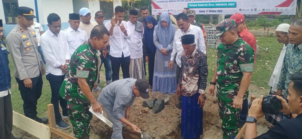 ACEH JAYA – Kodim 0114/Aceh Jaya mengikuti kegiatan Zoom Meeting peletakan batu pertama Koperasi Desa Merah Putih yang berlangsung di Desa Ladang Baro, Kecamatan Panga, Kabupaten Aceh Jaya, Jumat (17/10/2025). Kegiatan tersebut menjadi bagian dari pelaksanaan pembangunan fisik 80.000 gerai pergudangan dan perlengkapan Koperasi Merah Putih yang digagas pemerintah pusat.