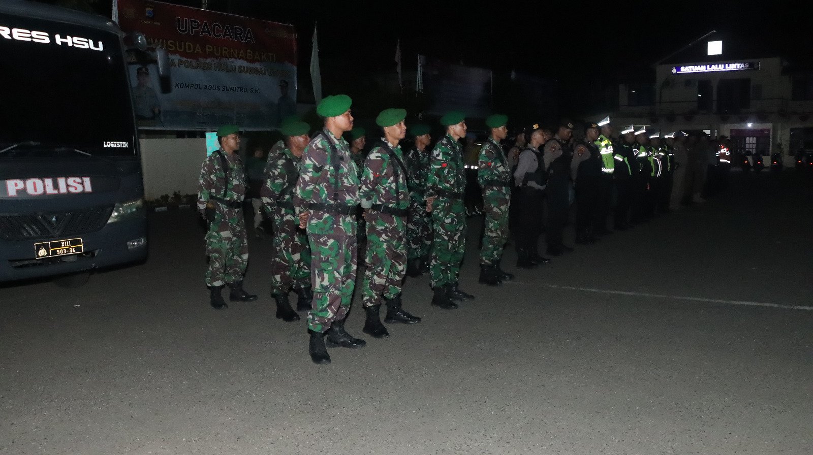 Kegiatan diawali dengan apel gabungan di Lapangan Mapolres HSU yang dipimpin langsung oleh Kabag Ops Polres HSU, AKP Achmad Jarkasi, S.H., dengan diikuti oleh personel TNI, Polri, dan Satpol PP yang terlibat dalam pengamanan wilayah.